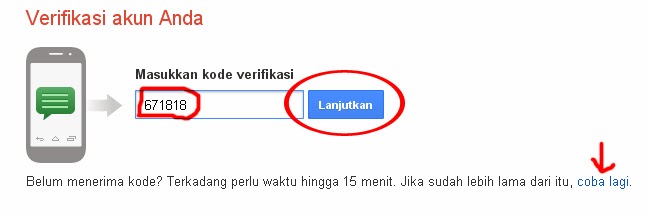 Jika anda belum mendapatkan SMS dari google anda bisa klik pada Link coba lagi seperti yang bertanda ↓ di atas. Jika sudah klik Lanjutkan.